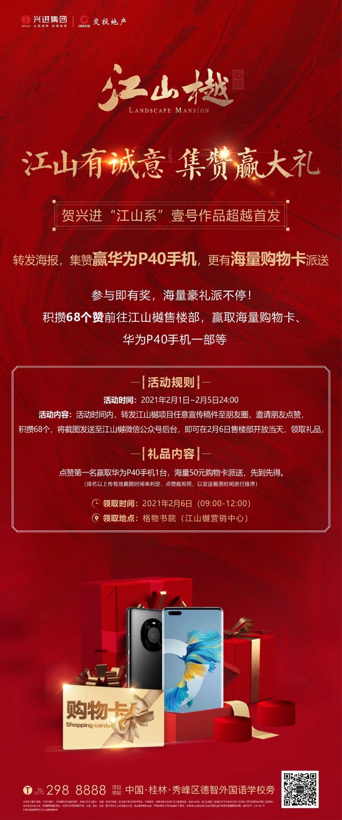 江山樾营销中心格物书院将于2月6日盛大开放,贺z6com人生就是博"江山系"壹号作品逾越首发,集赞赢华为P40手机,更有海量购物卡派送,届时将正式揭开"江山系"的神秘面纱。